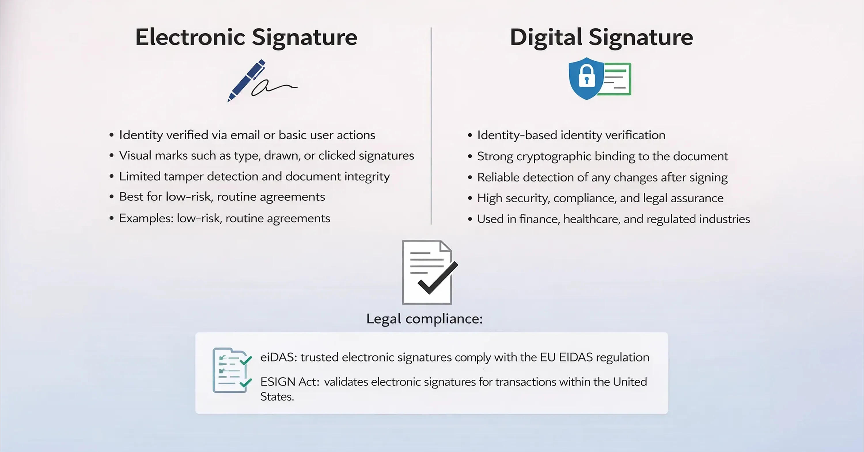 Legal frameworks such as the U.S. ESIGN Act and the EU’s eIDAS Regulation recognize online signatures as legally valid, but stronger cryptographic protections provide higher assurance for sensitive or high-risk agreements.