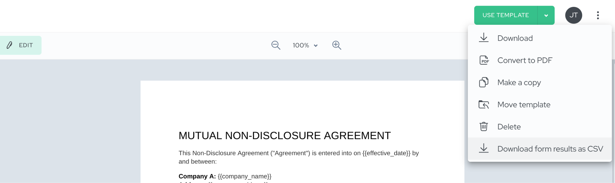 Illustration: Once your signers have signed the NDA based on your template, simply return to this template detail view and from the upper right corner choose “Download form results as CSV”.