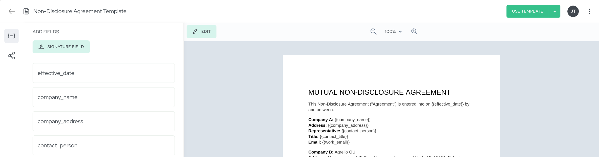 Consider how this works for a typical sales NDA workflow. When you create your NDA template in Agrello, you design it with data collection in mind -company name, contact person, work email, country, agreement effective date, and any specific preferences like marketing communication opt-outs.