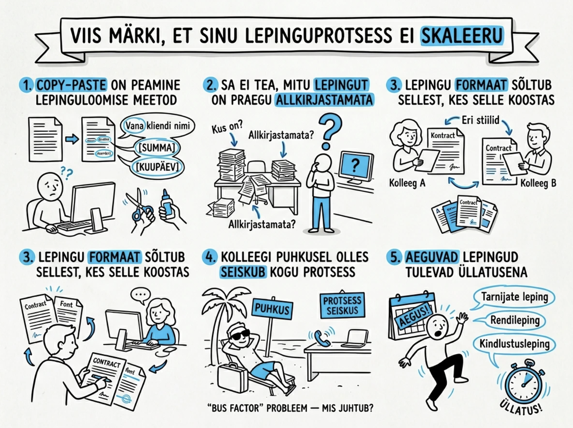 Neljandaks: kolleegi puhkusel olles seiskub kogu protsess. Kui ainult üks inimene teab, kus lepingud on ja kuidas neid koostada, oled sa ühe inimese haiguspäevast eemal kaaosest. See on klassikaline "bus factor" probleem — mis juhtub, kui see inimene ei ole homme tööl?